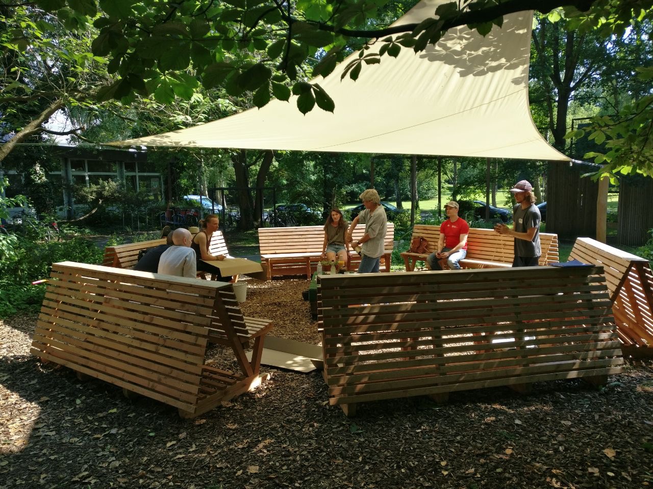 Um die Sache (fast) perfekt zu machen – das Grüne Klassenzimmer auch bei Kieler Schmuddelwetter bzw. im Kieler Supersommer nutzen zu können – wurde die „SitzWabe“ im Frühling 2020 mit einem flexiblen, leicht handhabbarem 33 qm Wettersegel überdacht. Es ist ein richtiger Hingucker, nur leider bei Regen ganz etwas zu knapp bemessen. Trotzdem … der Lern- und Begegnungsort „Grünes Klassenzimmer“ bietet jetzt eine einladende und gepflegte Atmosphäre direkt im gärtnerischen Idyll.