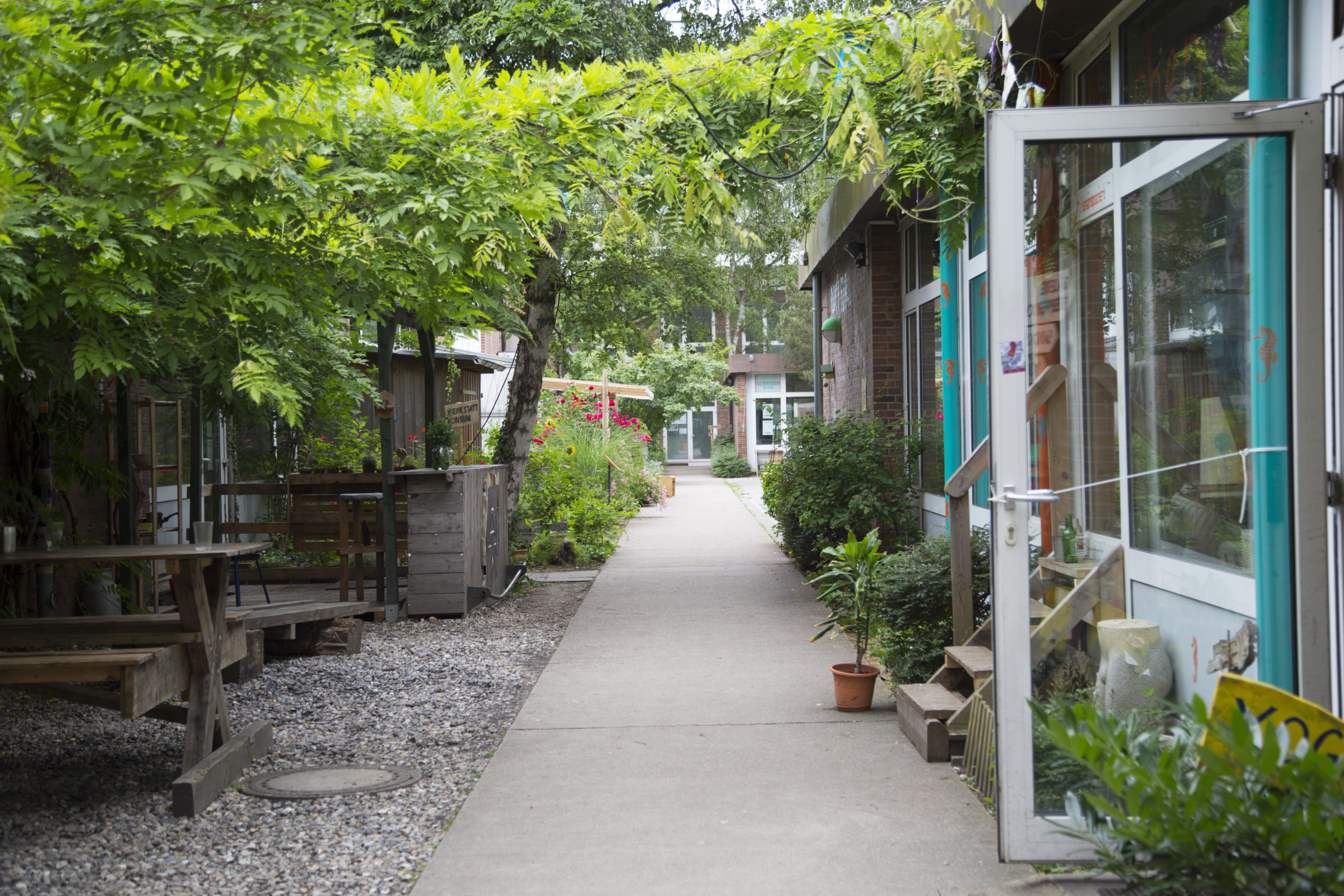 Das Gelände der Alten Mu ist ein Begegnungsort und ein Experimentierfeld für urbane Permakultur mit Hoch-, Hügel- und Vertikalbeeten, einem Waldgarten und vielem mehr.