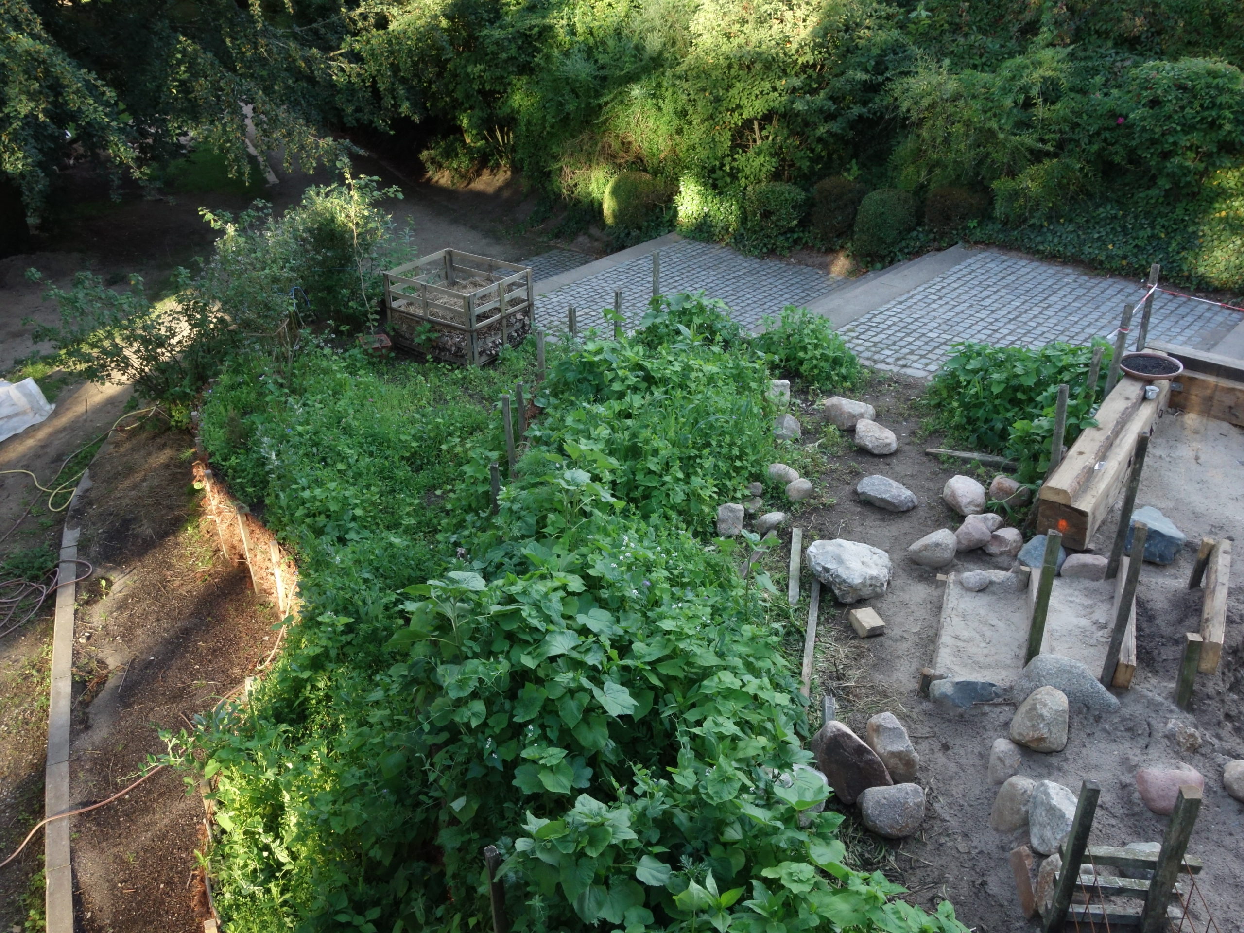 Mit der Hilfe vieler Freiwilliger wurden fünf geschwungene Terrassenstufen eingebaut. Den Anfang machte ein 5-tägiges Seminar in Kooperation mit den Paritätischen Freiwilligendiensten. Bis heute wurden sie mit essbaren Sträuchern, mehrjährigen Stauden und insektenfreundlichen Gewächsen begrünt, darunter Besonderheiten wie Wuweizi, Zaubernuss oder Wildspargel. Über eine Treppe und einen kleinen Trampelpfad lässt sich der Garten nun erkunden und schon bald wirst du von der geplanten Sitzbank aus die letzten Sonnenstrahlen des Tages genießen können.